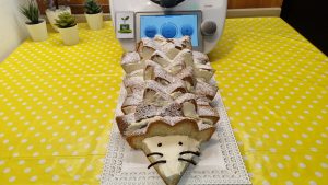 Tagliare il pandoro a metà per il senso della lunghezza. Tagliare ogni metà a fette di 2 cm circa di spessore. Con la base del pandoro tagliare un triangolo per formare la testa del riccio. Sulla prima fetta mettere solo da un lato uno strato di crema, sulle restanti fette mettere uno strato di crema su entrambi i lati e posizionare le fette alternandole per formare il dorso del riccio. Mettere la crema sulla superficie del triangolo, per creare la faccia del riccio posizionare le gocce di cioccolato per formare gli occhi e con dei pezzetti della rondella di liquirizia formare i baffi.