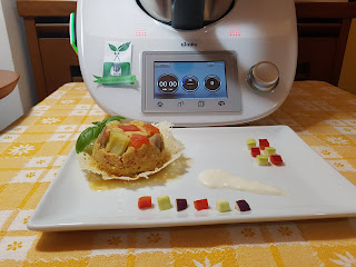 Unire il sale, il pepe, la noce moscata, le uova ed il trito messo precedentemente da parte e frullare per 10 secondi a velocità 6. Ungere 6 stampini con il burro, mettere sulla base ed ai lati, alcuni dadini di verdure precedentemente messe da parte, versare sopra il composto e posizionarli nel varoma. Mettere l’acqua nel boccale senza lavarlo, chiudere con il coperchio il varoma, chiudere con il coperchio senza il misurino il boccale e posizionare sopra il varoma e cuocere per 25 minuti a temperatura varoma e velocità 2. Verificare la cottura ed eventualmente cuocere per altri 10 minuti a temperatura varoma e velocità 2. Lasciare raffreddare all’interno degli stampini i tortini.