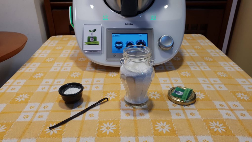 Iniziamo la ricetta mettendo nel boccale la vaniglia e tagliata a pezzi e tostarla per 30 minuti a 80 gradi con l’antiorario a velocità 2. Aggiungere lo zucchero e far polverizzare per un minuto a velocità 10.