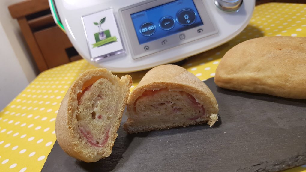 Trascorso il tempo riprendere l’impasto, posizionarlo su un piano di lavoro infarinato e stenderlo con il mattarello formando una sfoglia sottile. Dividere in due parti uguali la sfoglia e ritagliare delle strisce larghe circa 8 cm. Mettere in ogni striscia la pancetta, la scamorza ed arrotolarle formando i panini. Posizionarli su una teglia rivestita con carta da forno e lasciamo lievitare in forno spento per almeno un’ora.