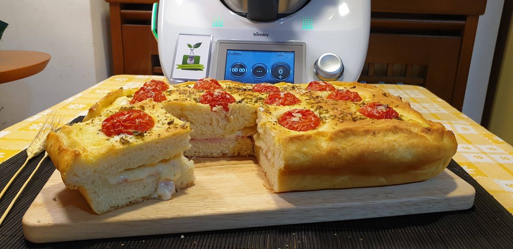 Trascorso il tempo, dividere l’impasto in due parti uguali. Stendere la prima metà dell’impasto su di un piano di lavoro, trasferire in una teglia rivestita con carta da forno e farcire con prosciutto, formaggio e parmigiano e tenere da parte. Stendere il resto dell’impasto, posizionarlo sopra il ripieno e sigillare bene i bordi.