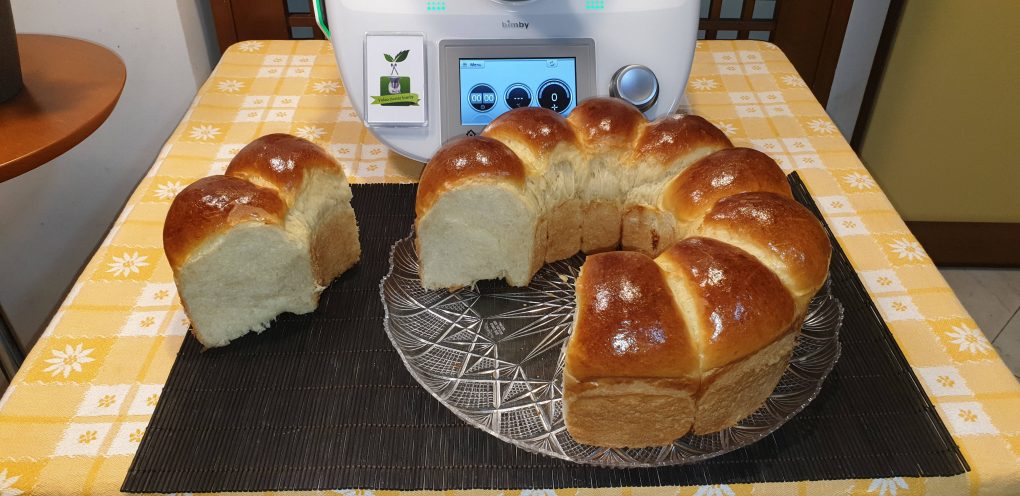 Iniziamo la ricetta mettendo nel boccale il latte, lo zucchero, il lievito e far sciogliere per 3 minuti a 37 gradi a velocità 3. Unire la farina di tipo manitoba, l’uovo, il miele, il sale, l’aroma di brioche e far impastare per 3 minuti in modalità spiga. Successivamente azionare il bimby per 3 minuti in modalità spiga ed aggiungere il mascarpone a cucchiaiate dal foro del coperchio. Al termine trasferire l’impasto in una ciotola, coprire con pellicola trasparente e riporre in forno spento per 3 ore. Trascorso il tempo riprendere l’impasto e dividerlo in 8 palline da 100 g l’uno circa e posizionarle in uno stampo a ciambella del diametro di 24-26 cm ben imburrato. Lasciar lievitare nuovamente per un’ora circa in forno spento.