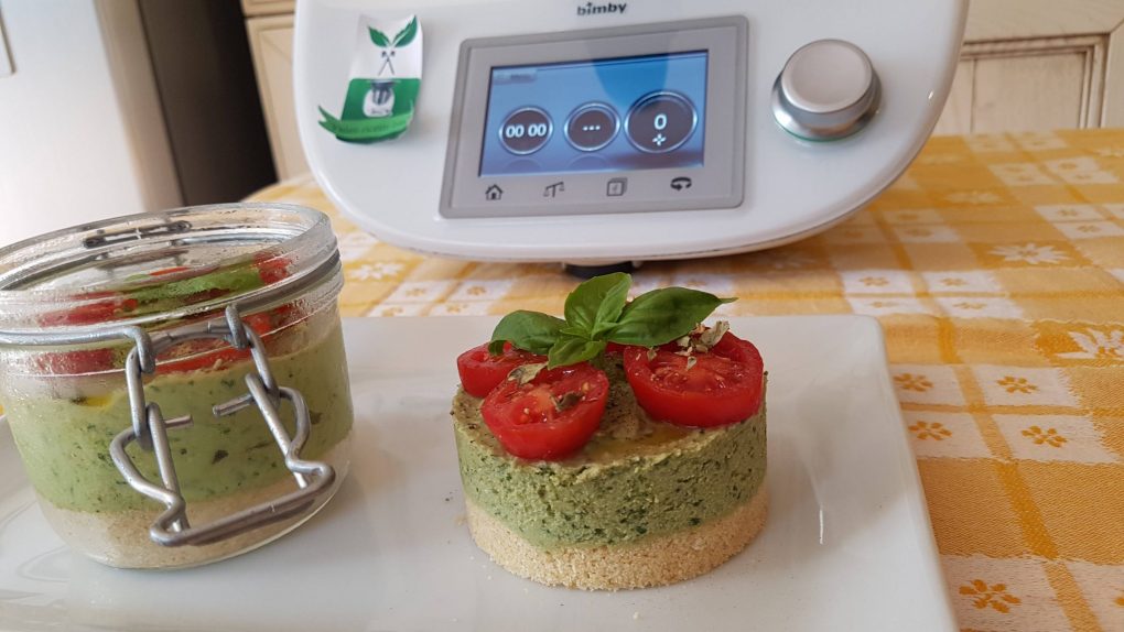 Mettere nel boccale i cracker e tritare per 10 secondi a velocità 8. Togliere il trito e metterlo da parte. Sciogliere il burro per 2 minuti a 50° velocità 3. Aggiungere il trito di cracker e amalgamare per 30 secondi a velocità 3. Versare il composto in dei contenitori di vetro o in coppa pasta e mettere da parte in frigorifero. Senza lavare il boccale, mettere il parmigiano ed i pinoli e tritare il tutto per 10 secondi a velocità 10. Aggiungere il basilico e l’olio e frullare il tutto per 30 secondi a velocità 7 spatolando. Aggiungiamo il formaggio spalmabile e amalgamiamo il tutto per 1 minuto a velocità 3. Versare il composto sulla basa di cheesecake e riporre in frigo per almeno 30 minuti. Dopo decorare con pomodorini tagliati e condire con un filo d’olio, il sale, il pepe e l’origano. Servire subito o conservare in frigo e uscire al bisogno.