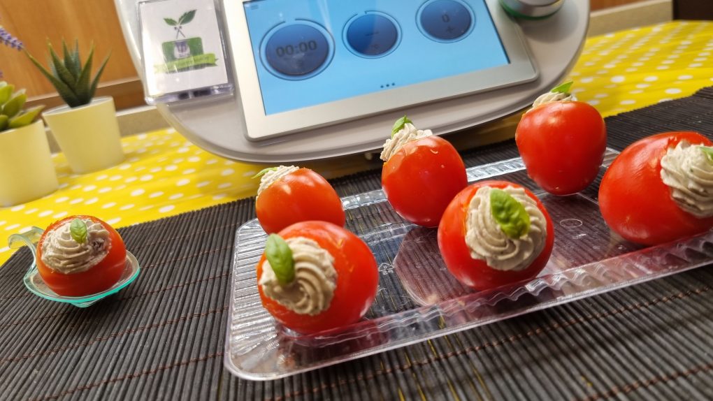 Per prima cosa tagliare la parte superiore dei pomodorini e svuotarli. Mettere nel boccale la feta, le olive, il basilico, l’olio, il pepe ed azionare il bimby per 30 secondi a velocità 5, al termine riunire sul fondo del boccale con la spatola. Successivamente azionare nuovamente il bimby per 30 secondi a velocità 5. Trasferire il composto in una sac-a-poche con beccuccio a stella e riempire i pomodorini. Servire decorando con foglioline di basilico.