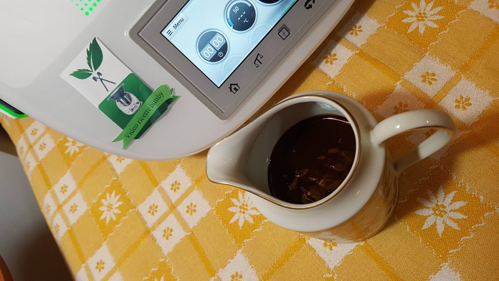 Mettere nel boccale il cioccolato e tritare per 10 secondi a velocità 10, togliere dal boccale e tenere da parte. Lavare e asciugare il boccale, versare la panna e lo sciroppo di glucosio e portare a bollore, 2 minuti a 100° velocità 1. Aggiungere il cioccolato e amalgamare per un minuto a velocità 2. Unire il burro e continuare per un minuto a velocità 3.