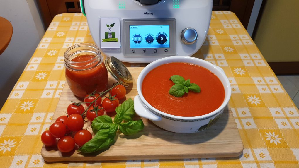 Successivamente cuocere per 25 minuti, a temperatura varoma, a velocità 2 con il cestello al posto del misurino. Al termine della cottura omogeneizzare per 1 minuto da velocità 6 a velocità 10. Unire l’olio, il sale, il basilico e far amalgamare per 30 secondi a velocità 2.