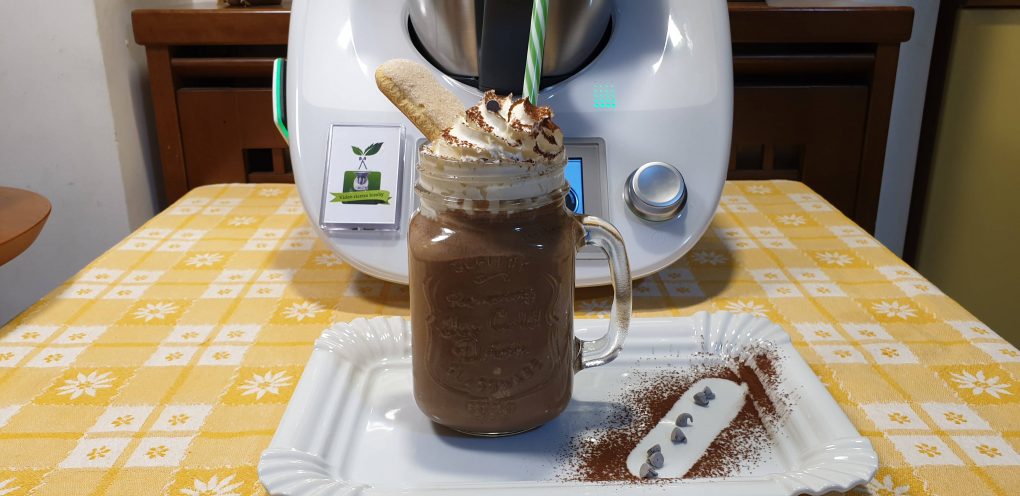 Iniziamo la ricetta mettendo nel boccale i savoiardi e far tritare per 8 secondi a velocità 7, al termine riunire sul fondo del boccale con la spatola. Aggiungere il caffè ristretto, il caffè solubile, la panna per dolci non montata, il gelato, il mascarpone, il cacao e far frullare per 1 minuto da velocità 6 a velocità 8. Versare in dei bicchieri e decorare con panna montata, gocce di cioccolato, savoiardi e cacao amaro. Servire subito.