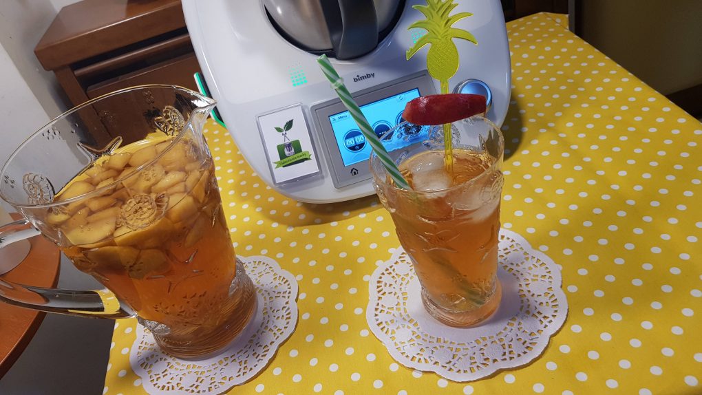 Iniziamo la ricetta mettendo nel boccale l’acqua, lo zucchero ed azionare il bimby per 10 minuti a 100 gradi a velocità 1. Successivamente inserire il cestello nel boccale, mettere le pesche mature tagliate a pezzetti, le bustine di tè e lasciare in infusione fino a quando non si sarà raffreddato del tutto. Togliere il cestello, filtrare il tè in una caraffa, aggiungere le pesche tolte dal cestello e riporre in frigo per almeno 2 ore prima di servire.