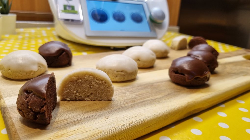 Formare i biscotti con gli impasti ottenuti. Staccare 30 g di impasto e realizzare delle palline da posizionare su una teglia rivestita con carta da forno. Cuocere in forno preriscaldato statico a 180 gradi per 15-20 minuti circa. Al termine lasciare intiepidire e nel frattempo preparare la glassa. Mettere nel boccale lo zucchero e far polverizzare per 10 secondi a velocità 10. Aggiungere l’acqua ed azionare il bimby per 10 secondi a velocità 5. Togliere dal boccale 210 g di glassa e tenere da parte. Al resto della glassa aggiungere il cacao amaro ed azionare il bimby per 10 secondi a velocità 5. Con le due glasse ottenute, glassare i biscotti. Consigliamo di consumare i biscotti dopo 4-6 ore. Si conservano chiusi in contenitore ermetico per 3-5 giorni.