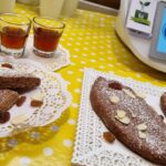 Mettere nel boccale lo zucchero e far polverizzare per 10 secondi a velocità 10, al termine riunire sul fondo del boccale con la spatola. Aggiungere la farina, la farina di mandorle, l’ammoniaca, il sale ed azionare il bimby per 10 secondi a velocità 10. Unire l’uovo, lo strutto, il latte, l’aroma di vaniglia, la pasta d’arancia, la pasta di limone, la cannella e far amalgamare per 50 secondi a velocità 5. Al termine togliere 600 g di impasto dal boccale e tenere da parte formando un panetto. Unire all’impasto rimasto nel boccale il cacao amaro ed 1 cucchiaio di latte e far amalgamare per 30 secondi a velocità 5.