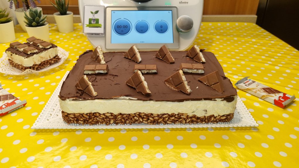 Senza lavare il boccale, mettere il mascarpone, lo zucchero messo da parte ed azionare il bimby per 2 minuti a velocità 3. Versare nella ciotola con la panna ed amalgamare bene. Sciogliere la gelatina ammollata e ben strizzata in un pentolino con i 20 g di latte, lasciare intiepidire e successivamente versare nella ciotola con la panna ed il mascarpone ed amalgamare bene. Aggiungere i kinder cereali a pezzetti ed amalgamare bene. Versare il composto sulla base di riso soffiato, livellare bene e riporre in frigo per almeno 3 ore.
