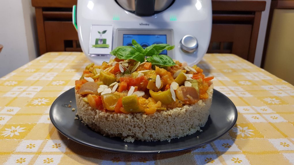 Mettere nel boccale l’acqua, l’olio, il sale e portare ad ebollizione per 7 minuti a 100 gradi a velocità 1. Al termine azionare il bimby senza impostare il tempo con l’antiorario a velocità 1 e versare dal foro del coperchio il cous cous. Chiudere con il misurino e far amalgamare per 1 minuto con l’antiorario a velocità 1. Al termine lasciare riposare all’interno del boccale il cous cous per 5 minuti. Nel frattempo foderare con carta da forno uno stampo con apertura a cerniera del diametro di 20 centimetri.