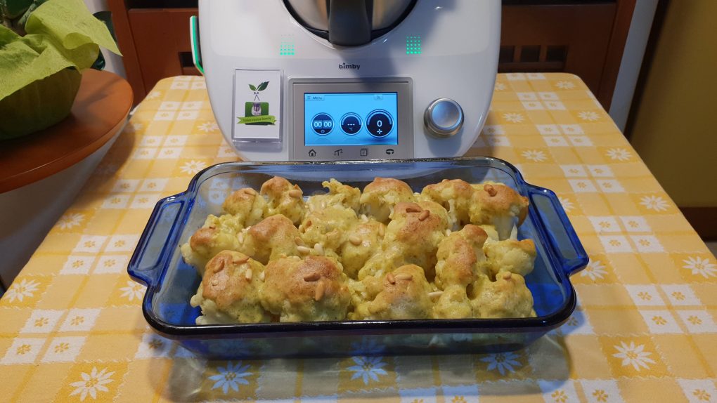 Trasferire il cavolfiore in una teglia unta con olio. Mettere nel boccale il pecorino, l’aglio, il prezzemolo, il timo, la salvia, la maggiorana, il pangrattato, il sale, il pepe, la noce moscata e far tritare per 10 secondi a velocità 10. Al termine riunire sul fondo del boccale con la spatola. Aggiungere le uova, l’olio e far amalgamare per 20 secondi a velocità 4. Versare il composto sul cavolfiore, cospargere con i pinoli e cuocere in forno preriscaldato statico a 200 gradi per 25/30 minuti circa. Servire caldo.