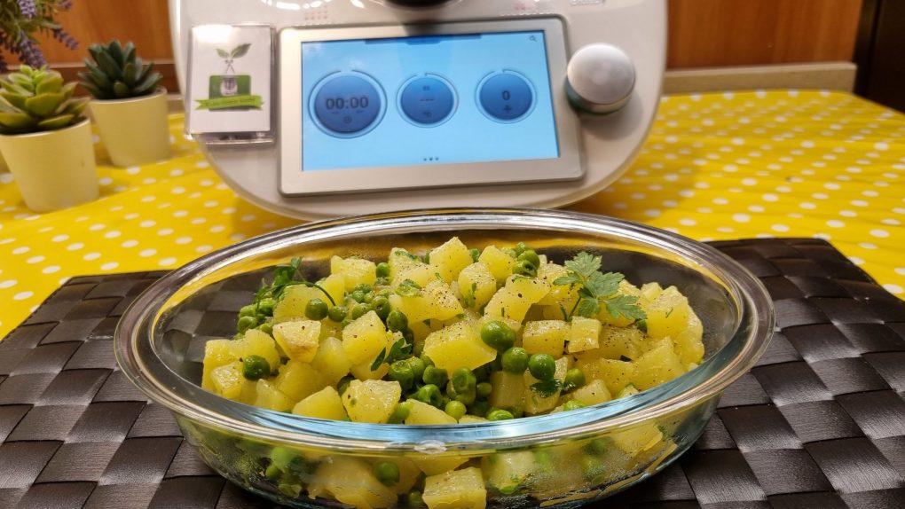 Mettere nel boccale l’acqua, ed un cucchiaino di sale. Mettere nel cestello le patate, i piselli  e posizionare nel boccale, chiudere con il coperchio e far cuocere per 25 minuti a temperatura varoma a velocità 2. Al termine trasferire i piselli e le patate in una ciotola, condire con olio, sale, pepe, prezzemolo ed amalgamare bene.