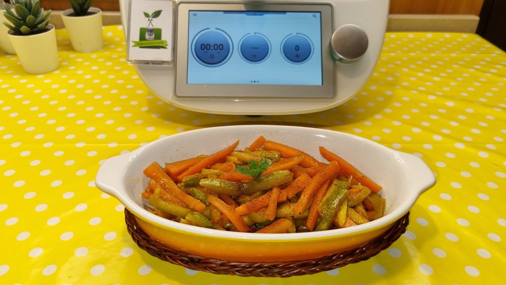 Mettere nel boccale la cipolla, l’aglio e far tritare per 3 secondi a velocità 6, al termine riunire sul fondo del boccale con la spatola. Unire l’olio e far insaporire per 4 minuti a 120 gradi a velocità 3, al termine riunire sul fondo del boccale con la spatola. Aggiungere le carote, le zucchine, la paprika, il pepe e far cuocere per 10 minuti a 100 gradi con l’antiorario a velocità soft. Successivamente unire la salsa di soia, il miele e far cuocere per 10 minuti a 100 gradi con l’antiorario a velocità soft. Impiattare e servire.