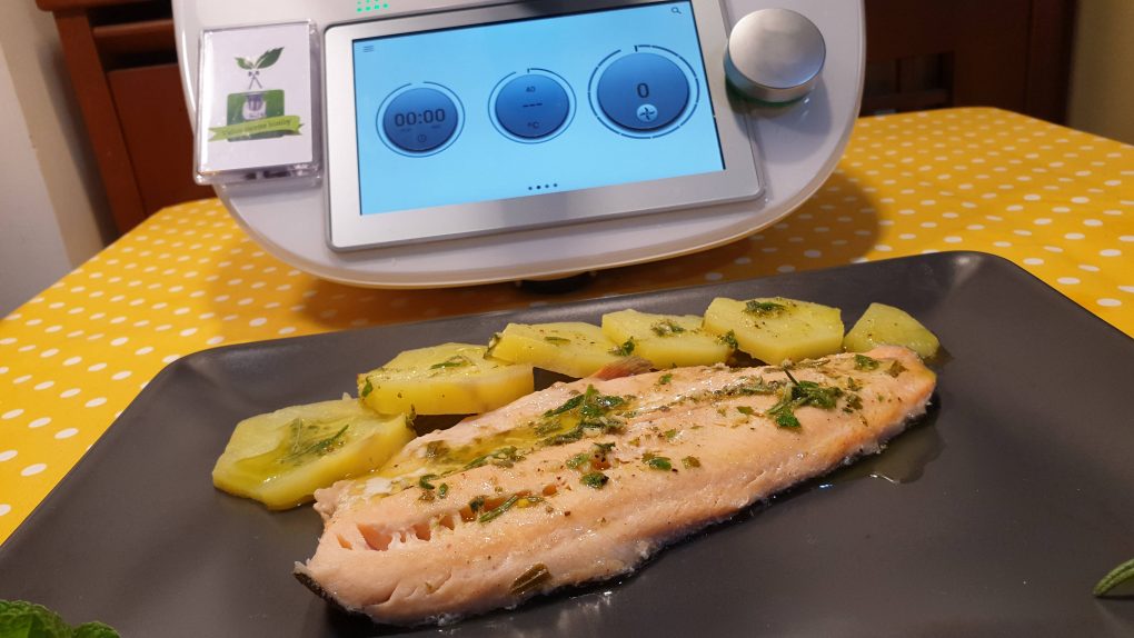 Senza lavare il boccale mettere l’acqua, chiudere con il coperchio senza al misurino, posizionare il varoma mettere le patate, posizionare il vassoio del varoma, mettere la carta da forno bagnata e strizzata, posizionare i filetti di trota e spennellare la superficie con l’emulsione di olio e limone messa da parte. Chiudere con il coperchio e far cuocere per 30 minuti a temperatura varoma a velocità 1. Terminata la cottura trasferire in un piatto da portata e servire.