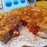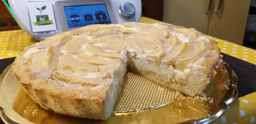 Assemblare la crostata. Riprendere la frolla dal frigo, stenderla tra due fogli di carta da forno e posizionarla su uno stampo da 28 cm, bucherellare il fondo con i rebbi di una forchetta. Versare sopra la crema di ricotta e livellare bene. Posizionare sulla crema le fettine di mela, successivamente versare sulle fettine di mela la copertura.