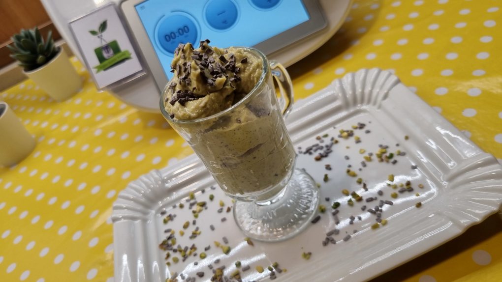 Mettere nel boccale lo zucchero ed azionare il bimby per 10 secondi a velocità 10, al termine riunire sul fondo del boccale con la spatola. Unire la granella di pistacchi ed azionare il bimby per 20 secondi a velocità 10, al termine riunire su fondo del boccale con la spatola. Aggiungere la crema di pistacchi, la ricotta, l’estratto di vaniglia o aroma di vaniglia e far amalgamare per 40 secondi a velocità 4. Al termine trasferire in bicchierini di vetro, decorare con le scaglie di cioccolato e servire.