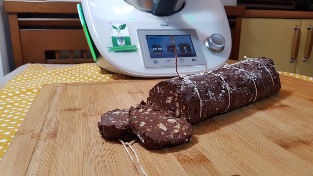 Mettere nel boccale lo zucchero e far polverizzare per 10 secondi a velocità 10, al termine mettere da parte. Senza lavare il boccale mettere i biscotti e far tritare per 5 secondi a velocità 4, al termine mettere da parte. Senza lavare il boccale mettere il burro e far sciogliere per 1 minuto a 37° a velocità 1. Aggiungere il cacao, lo zucchero, le uova, ed il rum e far amalgamare per 1 minuto a velocità 4. Aggiungere i biscotti e far amalgamare per 50 secondi con l’antiorario a velocità 3 spatolando. Togliere il composto dal boccale, disporlo sulla carta da forno e dare la forma di un salame, chiudere e riporre in frigo per almeno 2/3 ore. Affettare e servire.