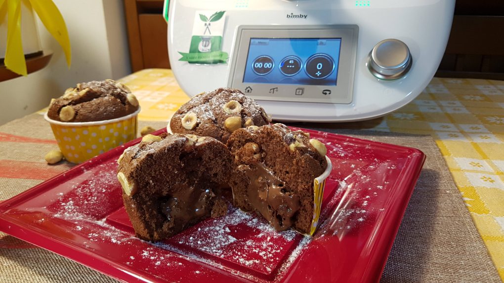 Togliere la farfalla. Mettere nel boccale i tuorli, la vanillina, lo zucchero e far montare per 4 minuti a velocità 4. Aggiungere lo yogurt, l’olio e far mescolare per 30 secondi a velocità 4. Aggiungere la farina, la fecola, il lievito, il cacao e far amalgamare per un minuto a velocità 4. Versare l’impasto nella ciotola con gli albumi montati, mescolando delicatamente con movimenti dal basso verso l’alto. Versare l’impasto nei pirottini per muffin, mettere al centro un cucchiaino di Nutella e coprire con le nocciole leggermente tritate. Cuocere in forno preriscaldato statico a 180° per 25-30 minuti circa. Cospargere con zucchero a velo e servire.