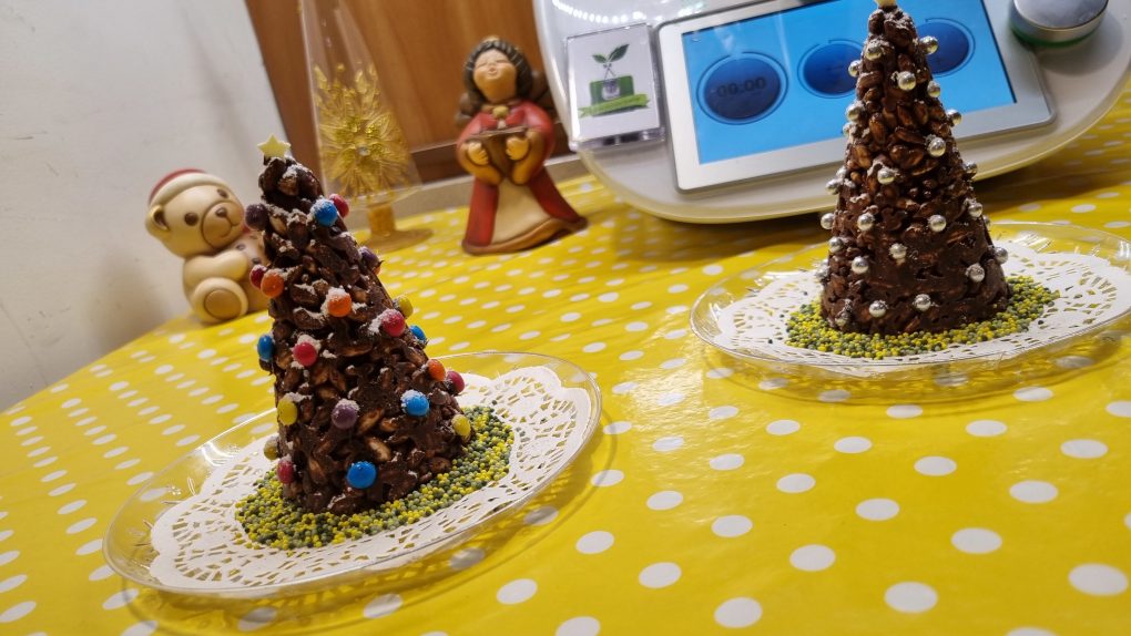 Mettere nel boccale il cioccolato fondente e far tritare per 5 secondi a velocità 7, al termine riunire sul fondo del boccale con la spatola. Successivamente azionale il bimby per 5 minuti a 50 gradi a velocità 3. Versare il cioccolato fuso nella ciotola con il riso soffiato ed amalgamare bene. Formare gli alberelli riempiendo i coni di carta per confetti con il composto di riso soffiato al cioccolato compattando bene sul fondo. Posizionare ogni cono in un bicchiere e riporre in frigo per 4 ore.