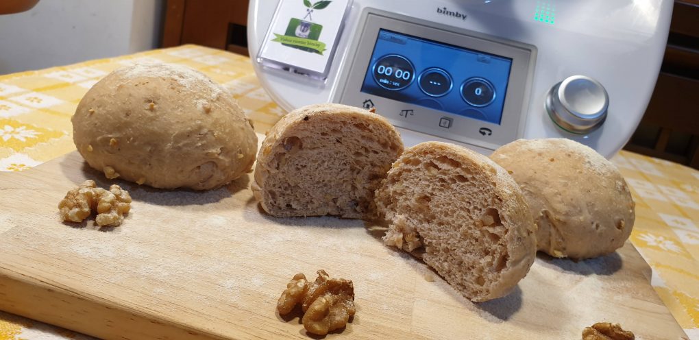 Iniziamo la ricetta mettendo nel boccale il lievito, lo zucchero, l’acqua ed azionare il bimby per 3 minuti a 37 gradi a velocità 3. Aggiungere la farina di tipo “0”, la farina di semola, i gherigli di noci, il sale, l’olio e far impastare per 4 minuti in modalità spiga. Trasferire l’impasto in una ciotola unta con olio, coprire con pellicola trasparente e riporre in forno spento per almeno 2 ore.