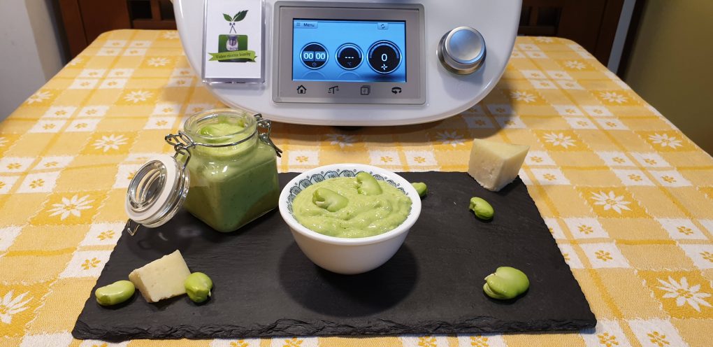 Iniziamo la ricetta mettendo nel boccale il pecorino e far tritare per 10 secondi a velocità 10. Unire le mandorle e l’aglio e far tritare per 10 secondi a velocità 8. Al termine riunire sul fondo del boccale con la spatola. Aggiungere le foglie di basilico e le foglie di menta e far tritare per 15 secondi a velocità 7, al termine riunire sul fondo del boccale con la spatola. Unire le fave e far tritare per 10 secondi a velocità 7, al termine riunire sul fondo del boccale con la spatola. Aggiungere l’olio ed il sale ed far amalgamare per 30 secondi a velocità 4.