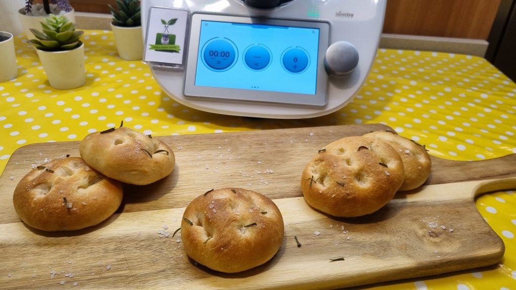 Mettere nel boccale il latte, il lievito, lo zucchero ed azionare il bimby per 2 minuti 37 gradi velocità 3. Unire la farina ed impastare per 1 minuto in modalità spiga. Aggiungere il sale ed impastare per 6 minuti in modalità spiga senza misurino e da foro del coperchio unire lo strutto un pó per volta. Trasferire in una ciotola capiente unta con olio, coprire con pellicola trasparente e lasciare lievitare in forno spento con luce accesa per 2 ore. Trascorso il tempo formare palline da 60 g ciascuna e posizionare su una teglia rivestita con carta da forno e lasciare lievitare per 1 ora. Trascorso il tempo schiacciare le palline con le dita. Emulsionare l’acqua con l’olio e spennellare la superficie delle focaccine, spolverizzare con il sale grosso ed il rosmarino e cuocere in forno preriscaldato statico a 200 gradi per 20 minuti. Impiattare e servire.