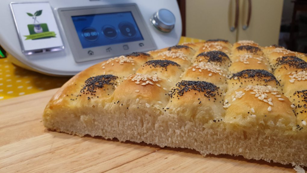 Trascorso il tempo di lievitazione, con una forchetta ripassare su tutta la decorazione. Spennellare la superficie con l’olio, spolverizzare con semi di sesamo e semi di papavero alternandoli e cuocere in forno preriscaldato statico a 200 gradi per 20-25 minuti circa. Terminata la cottura asciare intiepidire prima di servire.