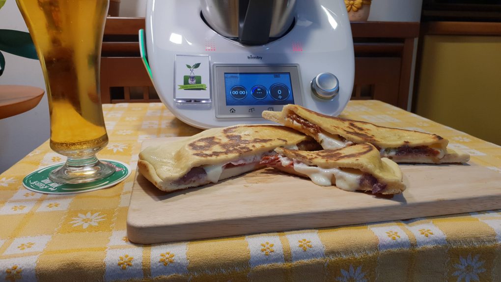Iniziamo la ricetta mettendo nel boccale il lievito, l’acqua, lo zucchero e far sciogliere per 2 minuti a 37 gradi a velocità 2. Unire la farina, la birra, l’olio, il sale e far impastare per 4 minuti in modalità spiga. Togliere l’impasto dal boccale e dividerlo in quattro parti uguali. Stendere ogni panetto in una sfoglia sottile. Ungere una padella del diametro di 24-26 cm con olio, posizionare un disco di pasta all’interno della padella, condire con prosciutto, mozzarella, pomodori secchi, olive e origano chiudere con un altro disco di pasta, sigillare bene i bordi, coprire con un coperchio e far cuocere per 10 minuti a fuoco medio – basso.