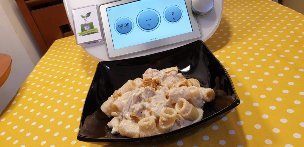 Iniziamo cuocendo la pasta in abbondante acqua salata in una pentola. Nel frattempo, mettere nel boccale l’olio, il guanciale e far insaporire per 3 minuti a 120 gradi a velocità soft. Unire la ricotta, il parmigiano, la granella di noci, le noci, il sale, il pepe e far amalgamare per 5 minuti a 80 gradi con l’antiorario a velocità 1. Unire le uova e far amalgamare per 2 minuti con l’antiorario a velocità 1, al termine mettere da parte.
