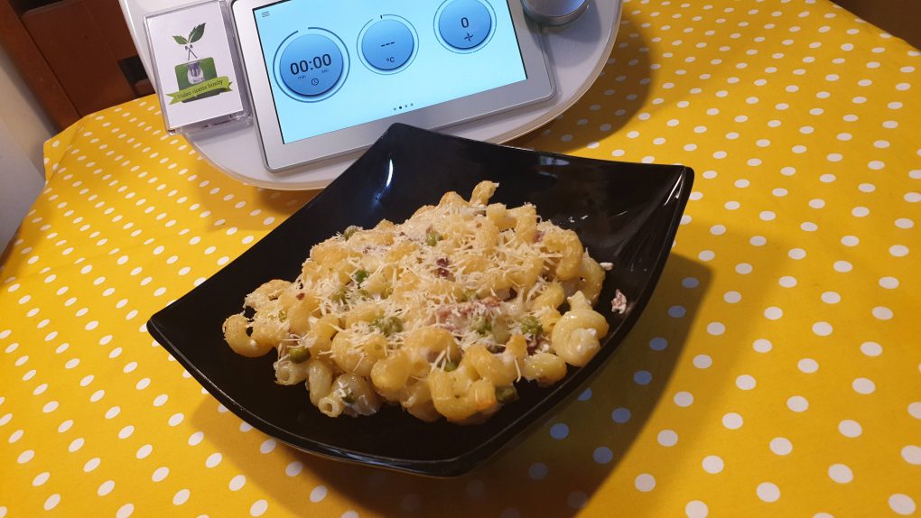 Mettere nel boccale lo scalogno e far tritare per 3 secondi a velocità 7, riunire sul fondo del boccale con la spatola. Aggiungere l’olio e far insaporire per 4 minuti a 120 gradi a velocità 3. Aggiungere lo speck e far insaporire per 2 minuti a 100 gradi a velocità 1. Unire i piselli, il vino, l’acqua, il sale, il pepe e far cuocere per 15 minuti a 100 gradi con l’antiorario a velocità soft. Unire la ricotta e far amalgamare per 2 minuti con l’antiorario a velocità soft. Mettere da parte in una ciotola capiente nel frattempo cuocere la pasta in abbondante acqua salata e scolarla al dente. Successivamente amalgamare bene la pasta al composto di piselli e ricotta ed aggiungere il parmigiano. Trasferirla in una teglia da forno. Spolverizzare con altro parmigiano grattugiato e cuocere in forno preriscaldato a 200 gradi per 18-20 minuti circa. Terminata la cottura, lasciare intiepidire prima di servire.