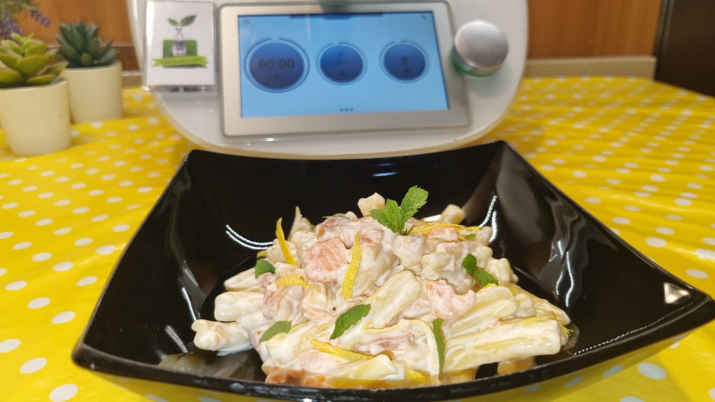 Senza lavare il boccale, mettere l’acqua, il sale ed azionare il bimby per 8 minuti a 100 gradi a velocità 1. Successivamente unire la pasta e far cuocere per il tempo indicato sulla confezione a 100 gradi con l’antiorario a velocità soft. Scolare la pasta, versare nella ciotola con la salsa ed amalgamare bene. Decorare con le foglioline di menta, lasciare raffreddare e servire.