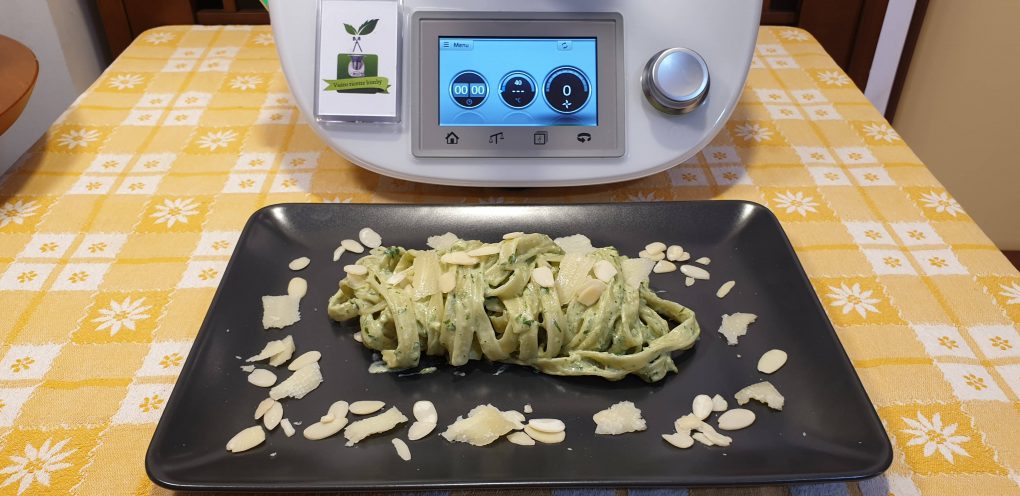 Senza lavare il boccale, versare l’acqua, aggiungere il sale e portare ad ebollizione per 7 minuti a 100 gradi a velocità 1. Aggiungere le tagliatelle e far cuocere per il tempo indicato sulla confezione a 100 gradi con l’antiorario a velocità soft. Ultimata la cottura, scolare la pasta tenendo da parte un misurino (100 ml) d’acqua di cottura. Aggiungere i tutto nella ciotola con la crema alle erbe ed amalgamare bene. Servire spolverizzando con le mandorle a lamelle e le scaglie di grana.