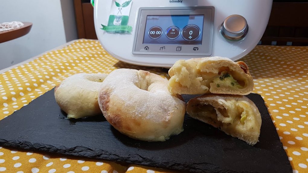 Mettere nel boccale l’acqua con un pizzico di sale, posizionare il cestello e mettere le patate tagliate a pezzi e far cuocere per 15 minuti a temperatura varoma a velocità 1. Togliere l’acqua ed il cestello dal boccale. Posizionare all’interno del boccale le patate cotte e far frullare per 10 secondi, con l’antiorario a velocità 6, al termine mettere da parte e lasciare raffreddare. Mettere nel boccale le zucchine, il basilico e far tritare per 10 secondi a velocità 4. Al termine mettere da parte. Mettere nel boccale la farina, il lievito, un tuorlo, il sale e le patate e far impastare per 3 minuti a velocità spiga. Stendere l’impasto su un piano di lavoro infarinato, formare dei rettangoli, farcire con la zucchina tritata e il formaggio a pezzi, arrotolarle e chiuderle formando delle ciambelle. Infarinare la superficie delle ciambelle e posizionarle su una teglia rivestita con carta da forno. Cuocere in forno preriscaldato a 180° per circa 20 minuti.