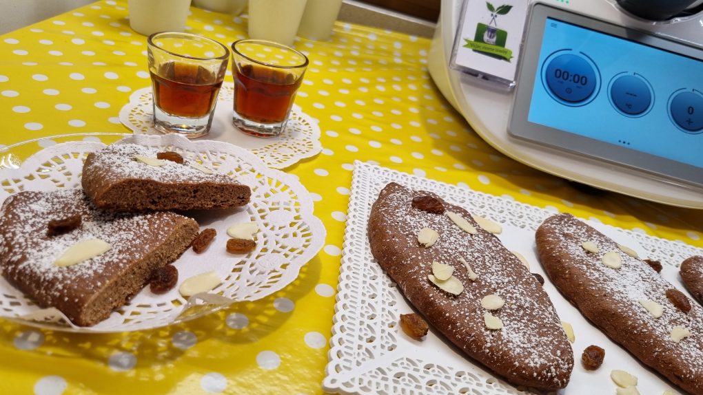 Mettere nel boccale lo zucchero e far polverizzare per 10 secondi a velocità 10, al termine riunire sul fondo del boccale con la spatola. Unire le mandorle, i savoiardi, i biscotti secchi, gli amaretti e far polverizzare per 10 secondi a velocità 10 spatolando. Aggiungere i fichi secchi ed azionare il bimby per 10 secondi a velocità 8. Unire la farina, il sale, il cacao, la noce moscata, la cannella, il lievito e far amalgamare per 40 secondi a velocità 5. Aggiungere gli albumi, il vin santo, l’uvetta ben strizzata e far impastare per 1 minuto in modalità spiga. L’impasto risulterà colloso.