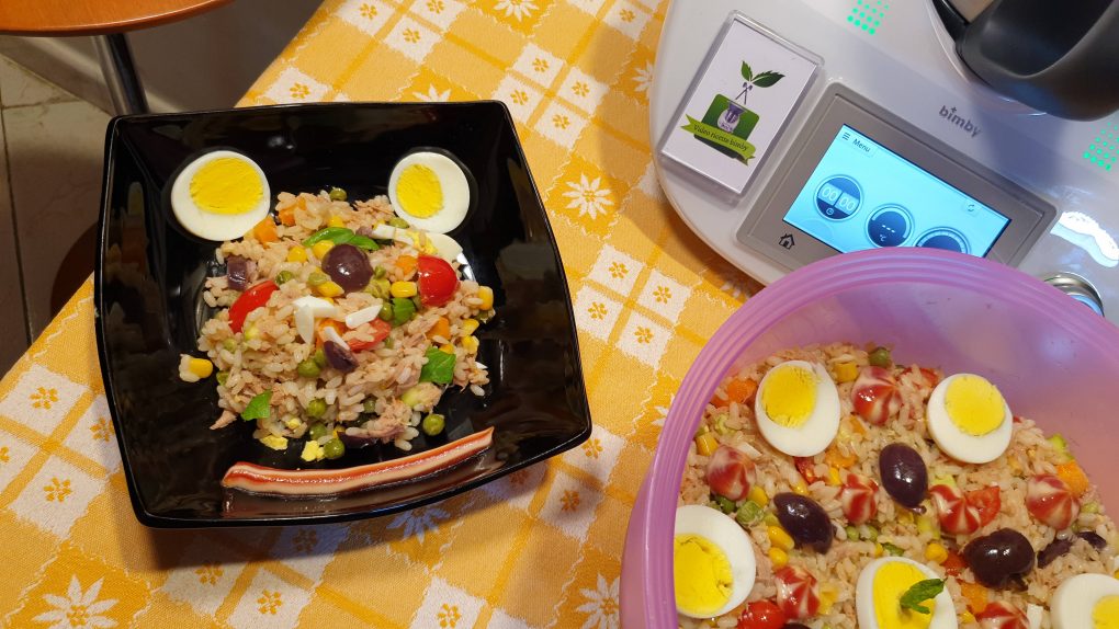 Mettere nel vassoio del varoma le zucchine, le carote e i piselli. Mettere nel recipiente del varoma le uova. Mettere nel boccale l’acqua, il sale, inserire il cestello e aggiungere il riso. Mescolare con la spatola il riso, chiudere con il coperchio e posizionare il varoma sopra il boccale e far cuocere per 25 minuti a temperatura varoma a velocità 2. Nel frattempo mettere in una ciotola di grandi dimensioni, il mais i pomodori fatti a pezzetti, le olive, il tonno, il basilico e la menta.