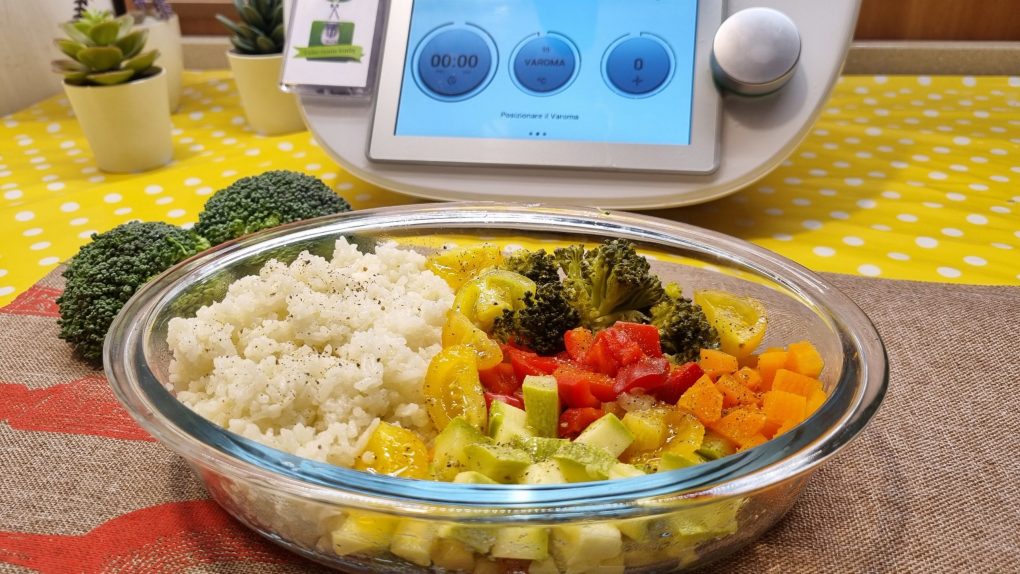 Al termine togliere il varoma, posizionare il cestello con il riso, con un cucchiaio smuovere i chicchi di riso, riposizionare il varoma e far cuocere per 20 minuti a temperatura varoma velocità 2.