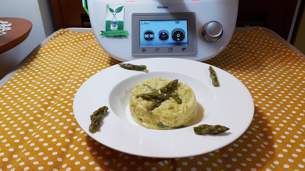 Mettere nel boccale il parmigiano e far tritare per 10 secondi a velocità 10, al termine mettere da parte. Mettere nel boccale la cipolla, i gambi puliti degli asparagi e far tritare per 10 secondi a velocità 6, al termine riunire sul fondo con la spatola. Aggiungere l’olio e far insaporire per 3 minuti a 120° a velocità 1. Aggiungere il riso, le punte degli asparagi, il vino e far cuocere per 3 minuti a 120° con l’antiorario velocità soft. Aggiungere l’acqua, il sale, il pepe, il dado, mescolare a fondo con la spatola e far cuocere per 10 minuti a 100° con l’antiorario a velocità soft. Aggiungere il latte dal foro del coperchio e far cuocere per 4 minuti a 100° con l’antiorario a velocità soft. Unire il burro, il parmigiano mescolare un po con la spatola e far amalgamare per un minuto con l’antiorario a velocità soft. Servire caldo.
