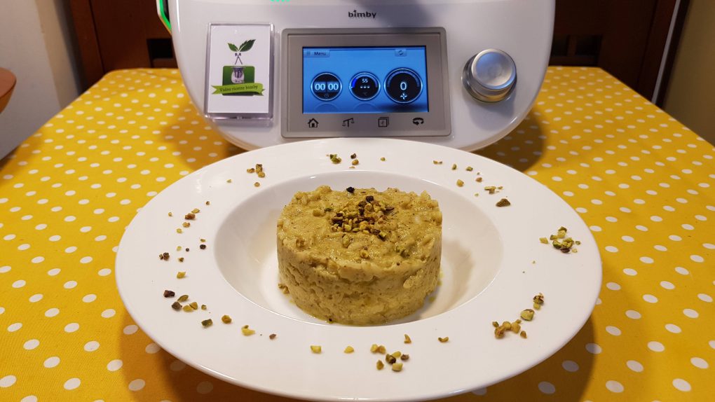 Senza lavare il boccale, mettere lo scalogno e far tritare per 3 secondi a velocità 6. Unire il burro ed azionare il bimby per 4 minuti a 120 gradi a velocità 3. Aggiungere il riso e far tostare per 2 minuti a 120 gradi con l’antiorario a velocità soft. Unire il vino bianco e far sfumare per 2 minuti a 100 gradi con l’antiorario a velocità soft senza misurino. Aggiungere l’acqua, il sale, il pepe, il dado vegetale, mescolare a fondo con la spatola e far cuocere per 5 minuti a 100 gradi con l’antiorario a velocità soft. Unire il pesto di pistacchi, amalgamare con la spatola ed azionare il bimby per 10 minuti a 100 gradi con l’antiorario a velocità soft.