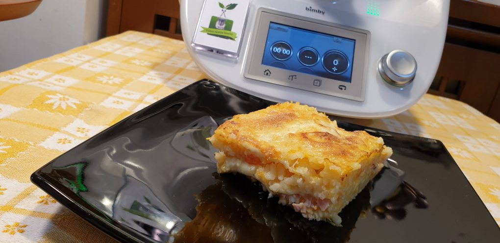 Iniziamo la ricetta mettendo nel boccale lo scalogno e far tritare per 5 secondi a velocità 7, al termine riunire sul fondo del boccale con la spatola. Unire l’olio e far insaporire per 3 minuti a 120 gradi a velocità 3. Posizionare la farfalla sulle lame, unire la zucca, 100 grammi di acqua e far cuocere per 10 minuti a 100 gradi con l’antiorario a velocità 1. Unire il riso, il dado, l’acqua, il sale, il pepe, mescolare a fondo con la spatola e far cuocere per 13 minuti a 100 gradi con l’antiorario a velocità soft. Unire 50 g di parmigiano e far amalgamare per 1 minuto a 100 gradi con l’antiorario a velocità soft. Versare metà del riso in una pirofila imburrata da 24 cm, distribuire su tutta la superficie il prosciutto, la mozzarella, ed il parmigiano grattugiato. Mettere il resto del riso, la mozzarella rimasta, spolverizzare con il parmigiano grattugiato e far cuocere in forno preriscaldato statico a 180 gradi per 20-25 minuti circa. Servire subito.