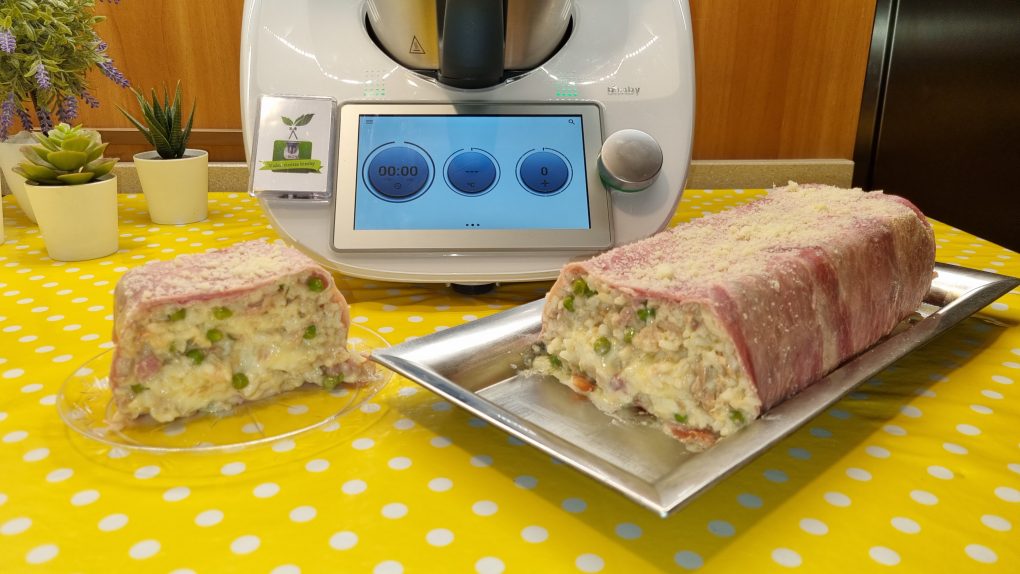 Aggiungere nel boccale il tonno, la panna da cucina, una parte del parmigiano grattugiato  ed amalgamare con la spatola. Far cuocere per 2 minuti a 100 gradi con l’antiorario a velocità soft. Al termine, mettere una parte del riso nello stampo, spolverizzare il parmigiano grattugiato, aggiungere la mozzarella tagliata a fettine, le sottilette e coprire con altro riso. Spolverizzare con il parmigiano, richiudere con il prosciutto cotto e cuocere in forno preriscaldato a 200 gradi per 20-25 minuti circa.