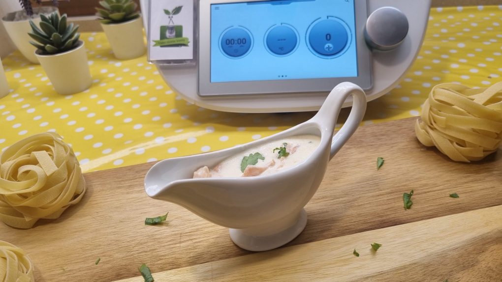 Mettere nel boccale il salmone, il burro, l’olio ed azionare il bimby per 4 minuti a 100 gradi con l’antiorario a velocità soft. Al termine unire la vodka ed azionare il bimby per 3 minuti a 100 gradi con l’antiorario a velocità soft senza misurino. Aggiungere la panna, il sale, il pepe e far cuocere per 4 minuti a 90 gradi con l’antiorario a velocità soft. Successivamente unire il prezzemolo tritato ed amalgamare con la spatola.