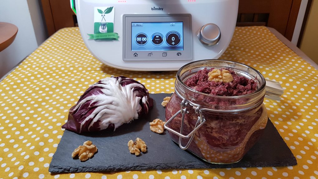 Mettere nel boccale la cipolla e tritare per 5 secondi a velocità 7, al termine riunire sul fondo con la spatola. Aggiungere l’olio e lo speck ed insaporire per 3 minuti a 100° a velocità 1. Aggiungere il radicchio e tritare per 10 secondi a velocità 6. Aggiungere l’acqua, il dado bimby vegetale, l’aceto e lo zucchero e cuocere per 7 minuti a 100° a velocità soft . Aggiungere le noci, mescolare con la spatola ed amalgamare per 1 minuto a velocità soft.Â