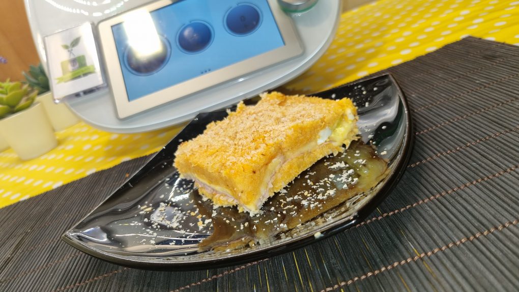Imburrare una pirofila da forno, mettere metà dal composto prelevandolo dal boccale, aggiungere il prosciutto, il formaggio e le uova sode tagliate a fette. Coprire con il rimanente composto di zucca e patate, spolverizzare con il pangrattato e mettere alcuni fiocchetti di burro sulla superficie. Cuocere in forno preriscaldato a 180 gradi per 30 minuti. Servire tiepido.