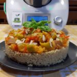 Mettere nel boccale l’acqua, chiudere con il coperchio, posizionare il varoma e mettere le zucchine, chiudere con il coperchio del varoma e far cuocere per 20 minuti a temperatura varoma a velocità 1. Al termine mettere da parte le zucchine e lasciare intiepidire.
