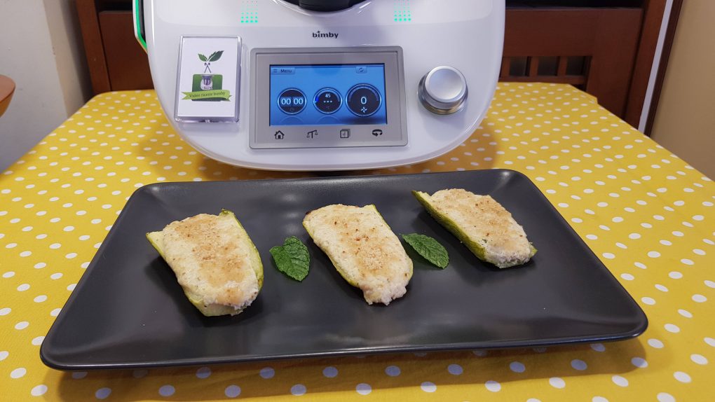 Mettere nel boccale la polpa delle zucchine, il prosciutto, la menta e far tritare per 7 secondi a velocità 5. Al termine riunire sul fondo del boccale con la spatola. Aggiungere la ricotta, il parmigiano, l’uovo, il sale, il pepe e far amalgamare per 50 secondi a velocità 3. Successivamente riempire le zucchine con il composto di ricotta e spolverizzare con il parmigiano ed il pangrattato. Cuocere in forno preriscaldato a 200 gradi per 15-20 minuti. Terminata la cottura, impiattare e servire.