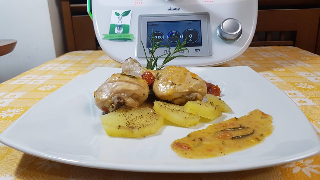 Mettere nel boccale lo scalogno, il sedano, la carota e tritare per 5 secondi velocità 7. Aggiungere l’olio ed insaporire per 3 minuti 120° velocità 3. Infarinare le cosce di pollo e metterle all’interno del boccale. Aggiungere i pomodorini tagliati a pezzetti, il rosmarino, il timo, la salvia, il sale ed il pepe e cuocere per 5 minuti a 120° con l’antiorario a velocità soft. Aggiungere il vino dal foro del coperchio e far sfumare per 5 minuti a temperatura varoma con l’antiorario a velocità soft senza misurino. Aggiungere l’acqua dal foro del coperchio e posizionare il varoma nel quale avremo messo le patate tagliate a fettine condite con sale, pepe e aromi. Cuocere per 30 minuti a temperatura varoma con l’antiorario a velocità soft. Impiattare e servire.