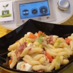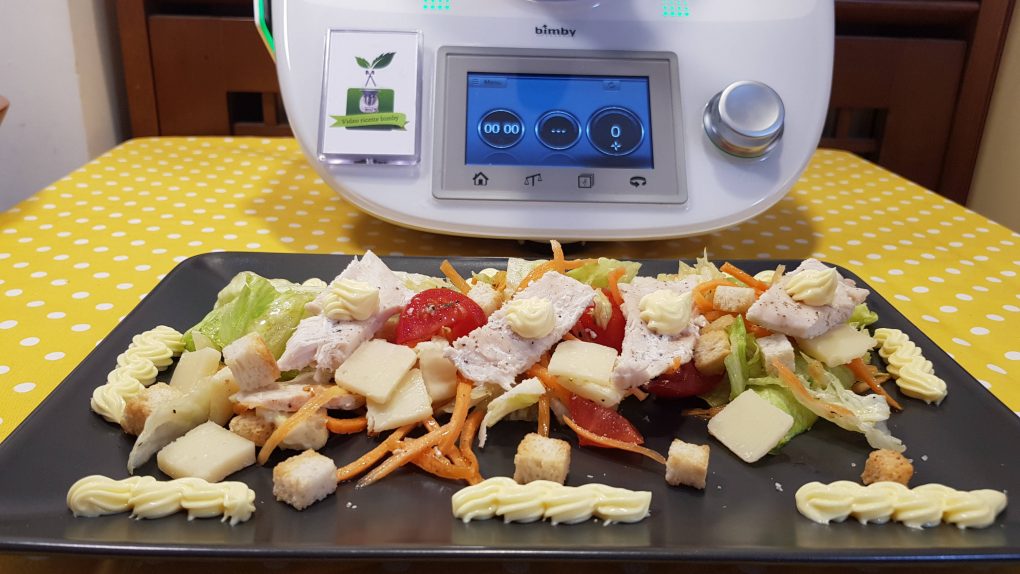 Iniziamo la ricetta mettendo il petto di pollo nel varoma e nel vassoio del varoma che abbiamo precedentemente oliato e condire con sale e pepe. Mettere nel boccale l’acqua, chiudere con il coperchio, posizionare il varoma con il pollo e far cuocere per 30 minuti a temperatura varoma a velocità 2. Terminata la cottura, lasciare raffreddare il pollo, e successivamente tagliarlo a pezzetti.