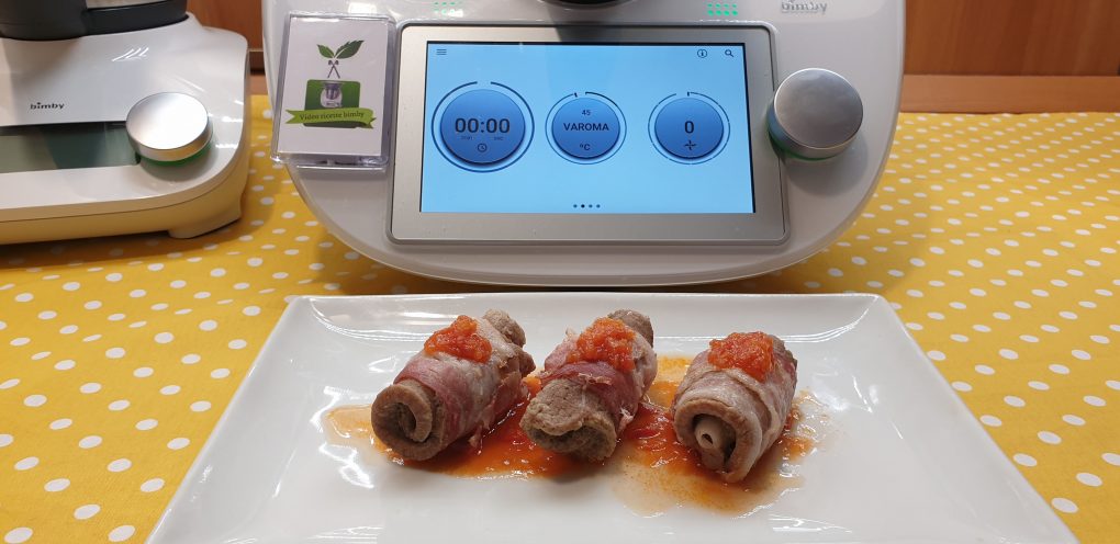 Mettere nel boccale la salsa di pomodoro, il sale, il pepe, l’acqua, l’olio, posizionare il cestello nel boccale, chiudere con il coperchio e far cuocere per 20 minuti a 100 gradi a velocità 2. Successivamente proseguire la cottura per altri 10 minuti a temperatura varoma a velocità 2. Disporre gli involtini in un piatto da portata, irrorare con la salsa e servire.